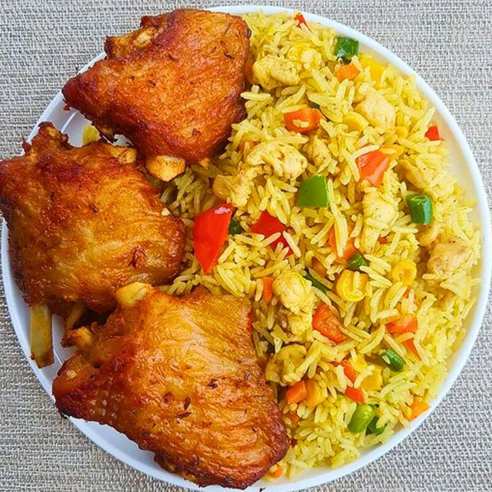 A fragrant, golden Nigerian Fried Rice loaded with a colorful medley of fresh vegetables and savory spices. Light, aromatic, and perfectly stir-fried—pair it with your choice of Chicken, Beef, Turkey, or Fish for the ultimate meal.